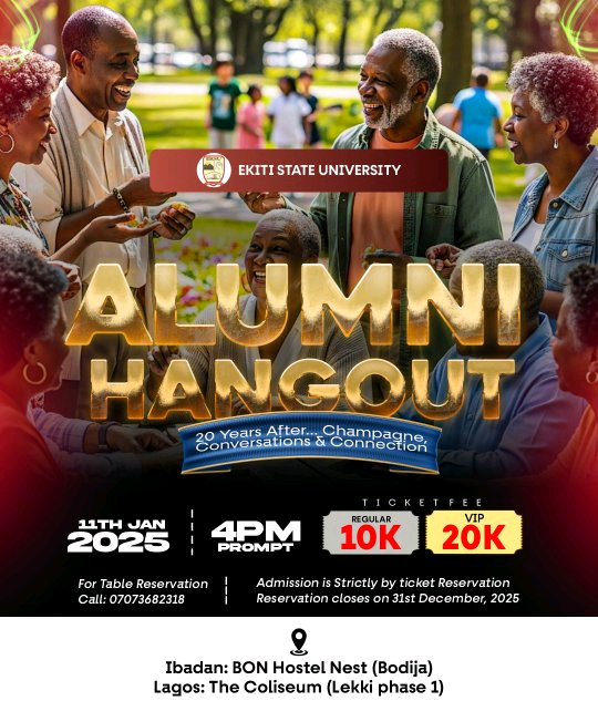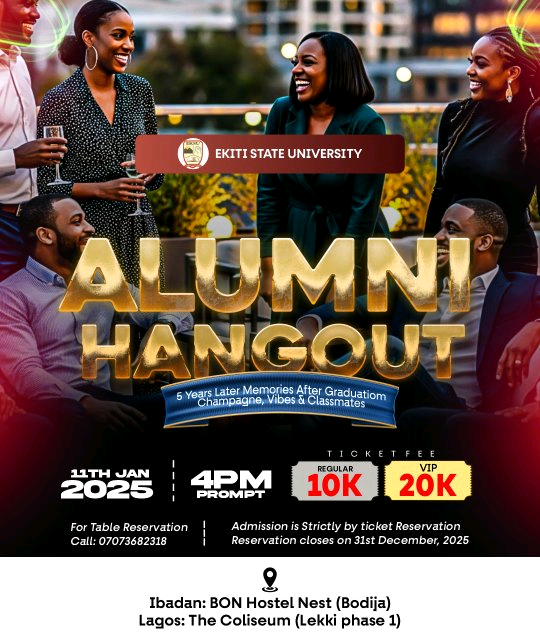 Hey EKSU legends! 🎓 Remember those late-night study vibes, campus games, and endless laughter? It’s time to hit pause on adulting and rewind to the good old days! Come mingle, laugh, and relive every epic memory with your fellow alumni—because once an Ekitiite, always an Ekitiite!”
